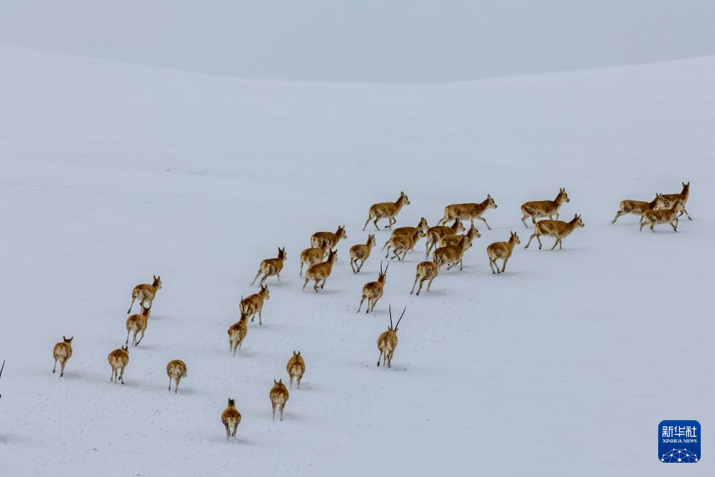 藏羚羊在雪地上奔跑(5月8日攝)。新華社記者 姜帆 攝