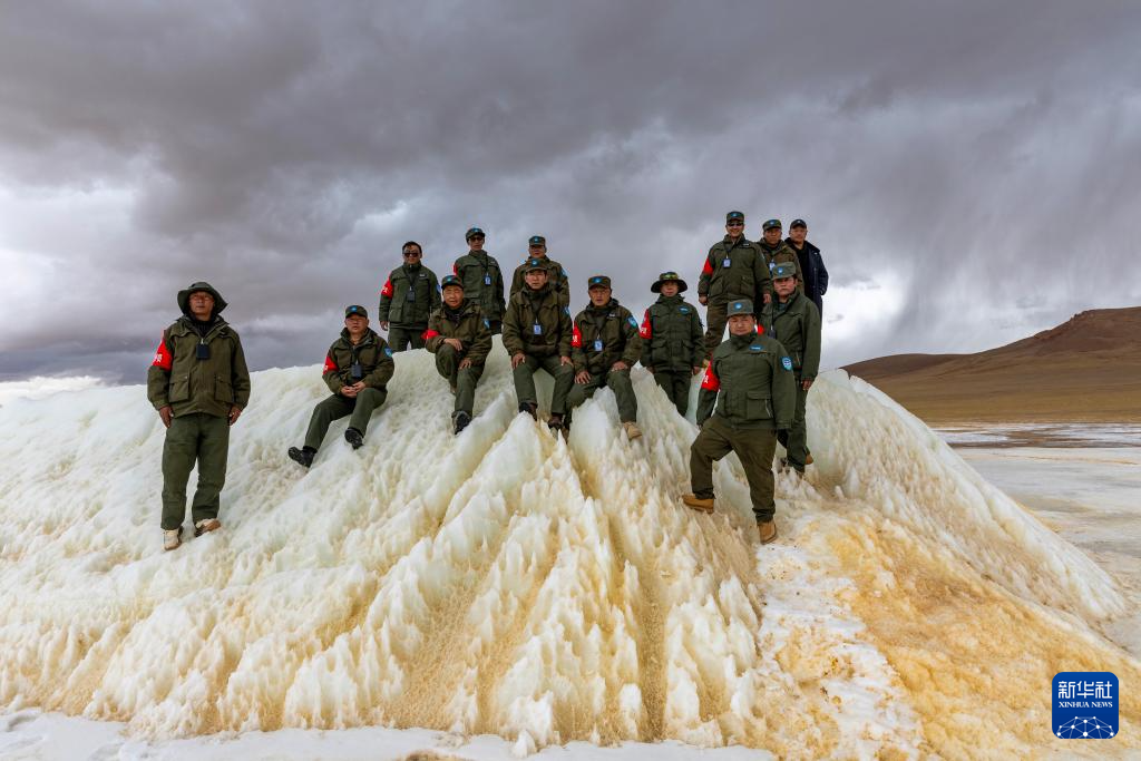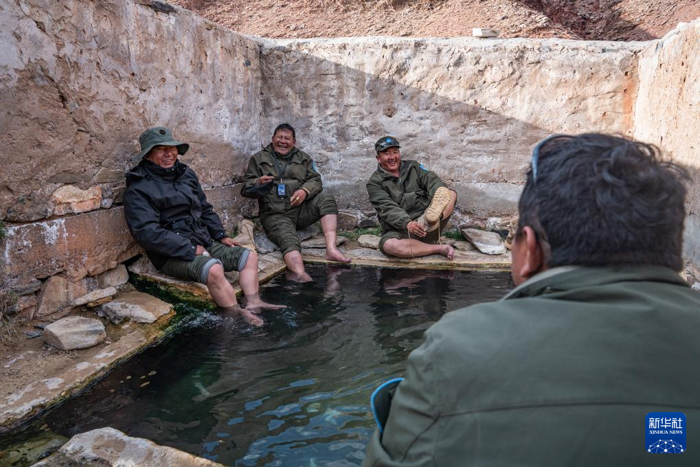 ??野生動物專業(yè)管護(hù)隊員們在一處廢棄的溫泉池中泡腳休息(5月8日攝)。新華社記者 丁增尼達(dá) 攝