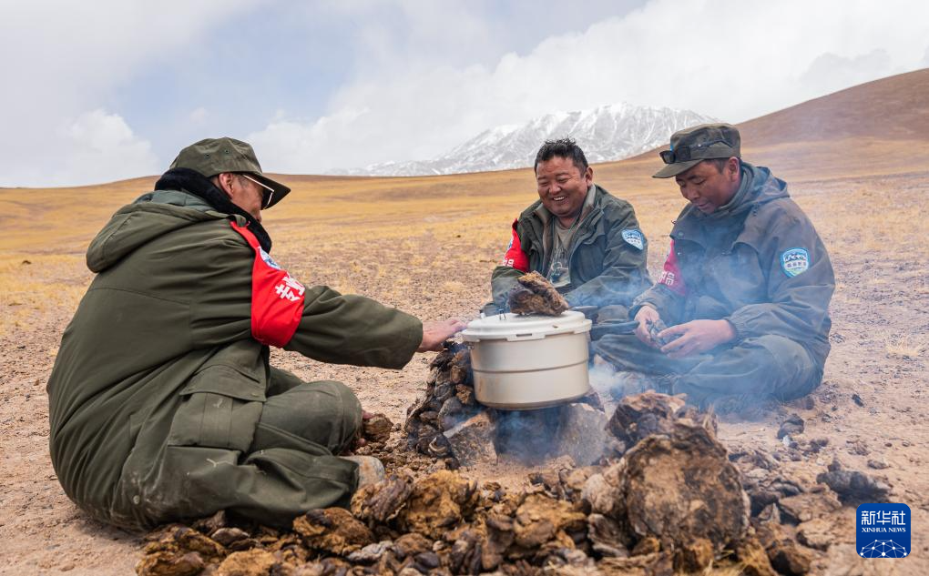 ??野生動物專業(yè)管護(hù)隊員在巡護(hù)途中就地取材,用野牦牛糞生火做飯(5月10日攝)。新華社記者 丁增尼達(dá) 攝