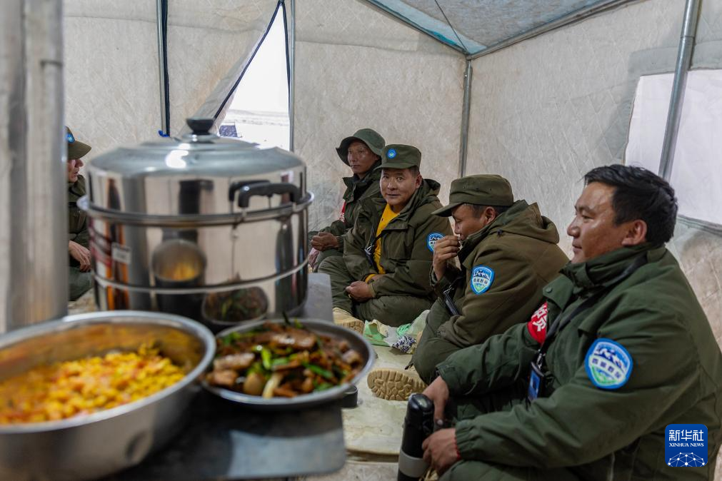 ??野生動物專業(yè)管護(hù)隊員們在宿營的帳篷中準(zhǔn)備吃飯(5月7日攝)。新華社記者 姜帆 攝