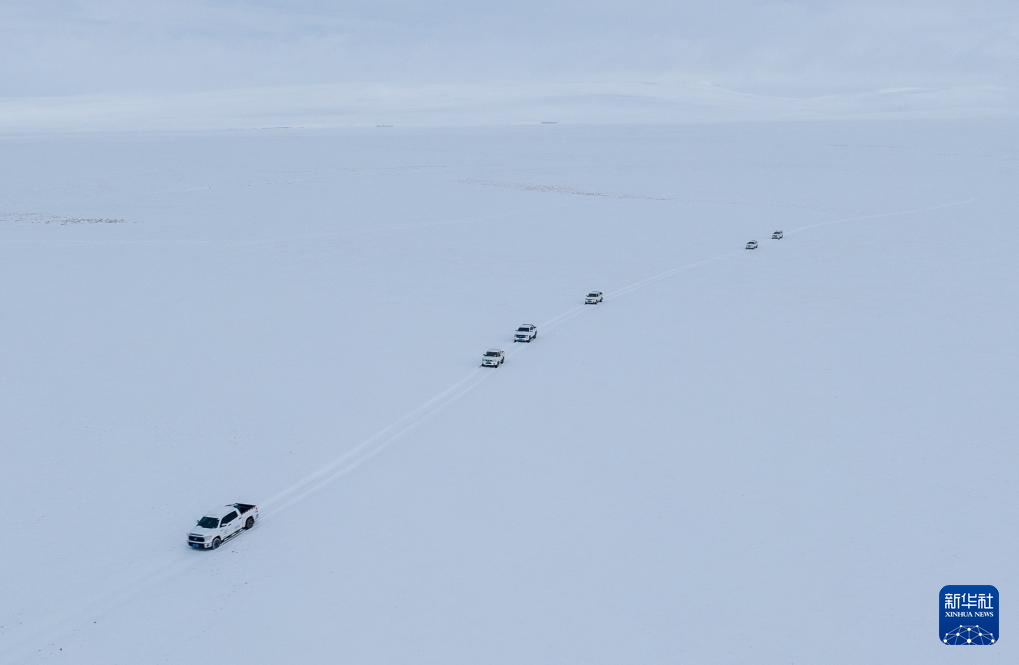 ??野生動物專業(yè)管護(hù)隊員的車隊在大雪中巡護(hù)(無人機照片,5月8日攝)。新華社記者 丁增尼達(dá) 攝