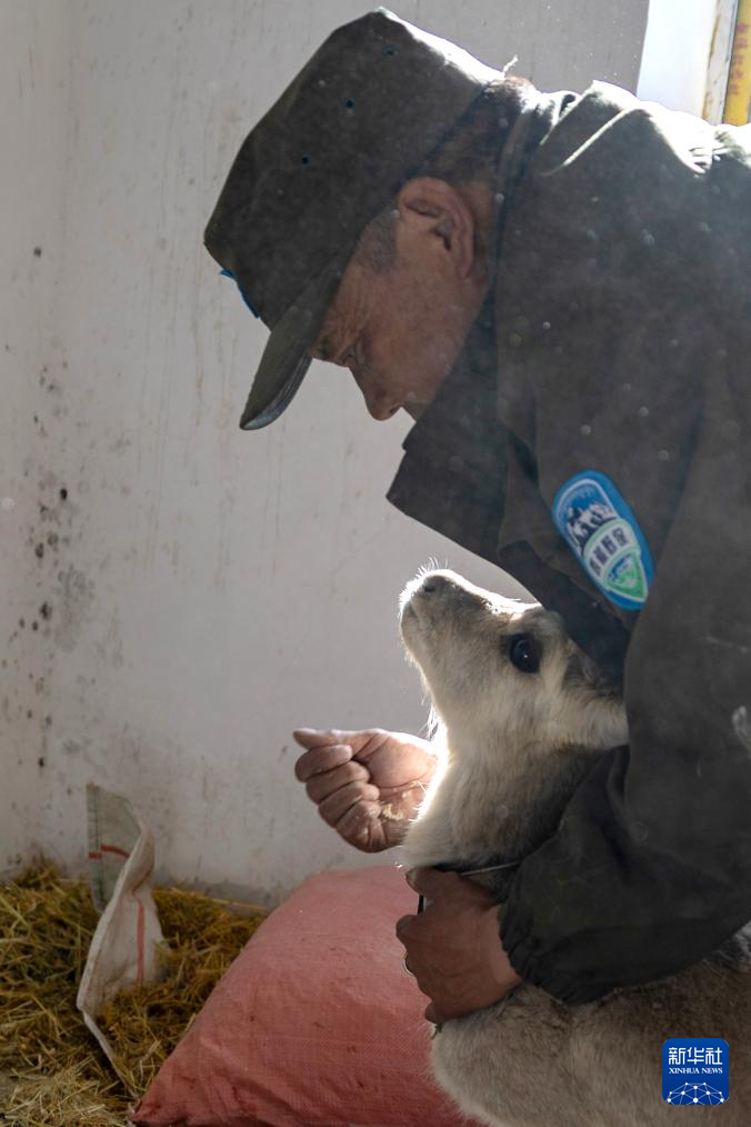 ??羅布玉杰站的野生動物專業(yè)管護(hù)隊員在出發(fā)巡護(hù)前給站里救護(hù)的受傷藏原羚喂糌粑(5月7日攝)。新華社記者 姜帆 攝