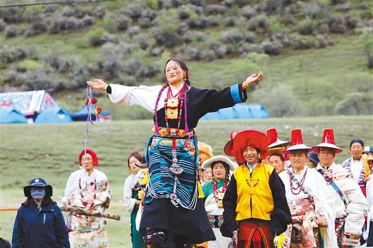 開幕式結(jié)束后,“春踏林周·悅賞杜鵑”——2024林周縣“春賞杜鵑”生態(tài)藝術(shù)共享季系列活動開始。為了給廣大游客提供專業(yè)的旅拍服務(wù),主會場的杜鵑花賞花點(diǎn)被巧妙地轉(zhuǎn)化為一個(gè)充滿自然韻味的“攝影棚”,并推出“非遺”服飾體驗(yàn),讓游客更深入地感受和體驗(yàn)當(dāng)?shù)貍鹘y(tǒng)文化的魅力。同時(shí),圍繞林周縣北部的生態(tài)環(huán)境、藝術(shù)人文和“非遺”文化等設(shè)計(jì)開展了徒步旅游活動,活動融合“農(nóng)文旅體”等內(nèi)容,從專業(yè)性的內(nèi)容植入、技能型的活動設(shè)計(jì)等方面來增強(qiáng)徒步旅游的品質(zhì)。旁多鄉(xiāng)的達(dá)龍藏戲、唐古鄉(xiāng)的熱振曲卓、阿朗鄉(xiāng)的“果諧”還給觀眾帶來了精彩的“非遺”表演。