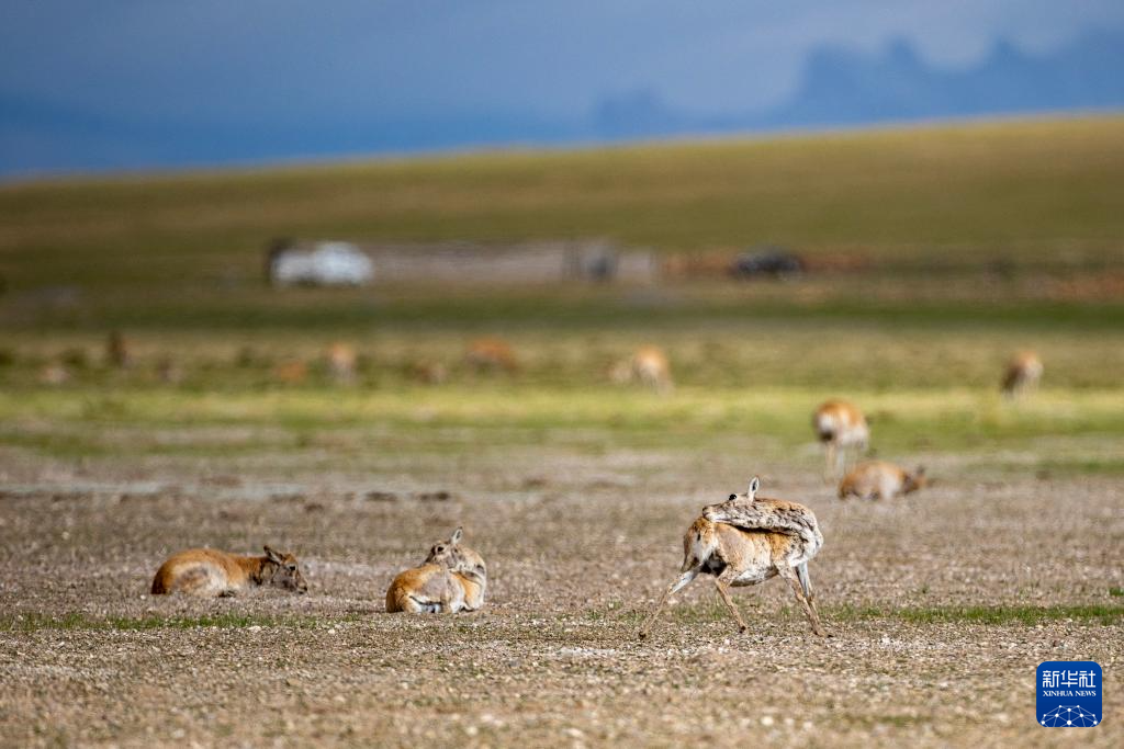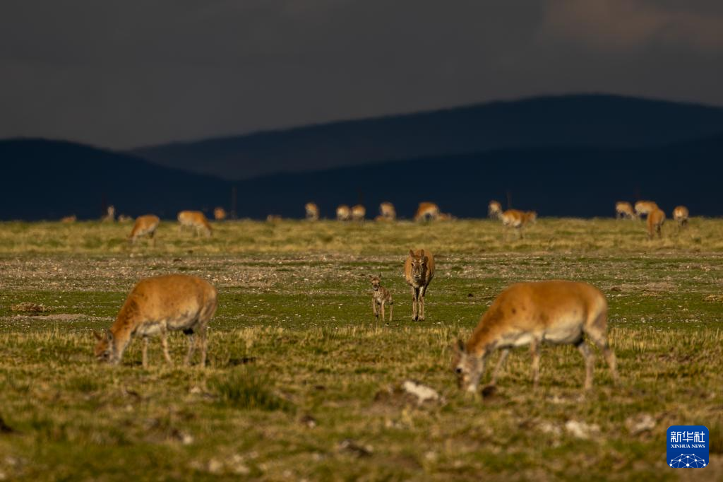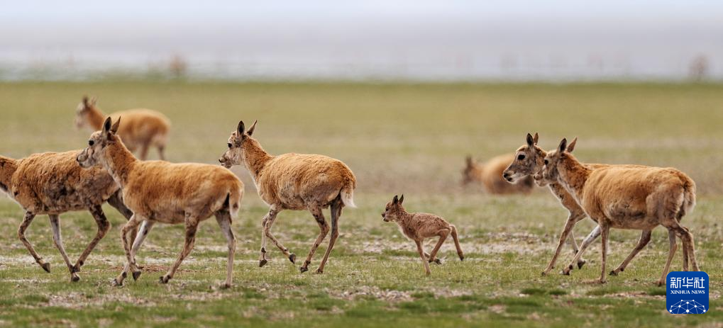 魯確塘草原上,藏羚羊護著剛出生的孩子(6月17日攝)。新華社記者 晉美多吉 攝