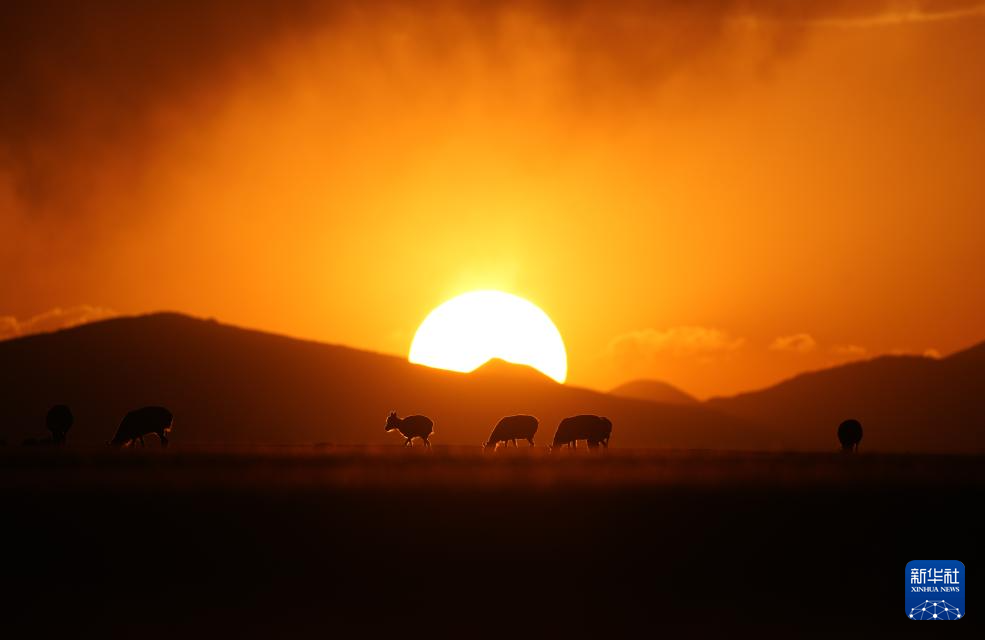 晚霞中魯確塘草原上待產(chǎn)的藏羚羊(6月16日攝)。新華社記者 費茂華 攝