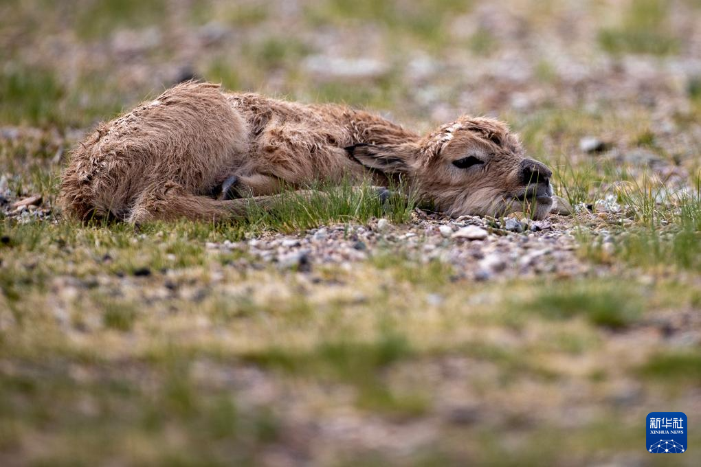 魯確塘草原上臍帶尚未脫落的小藏羚羊(6月17日攝)。新華社記者 姜帆 攝