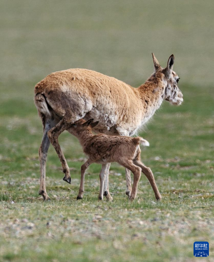 魯確塘草原上,小藏羚羊在吃奶(6月16日攝)。新華社記者 旦增尼瑪曲珠 攝??