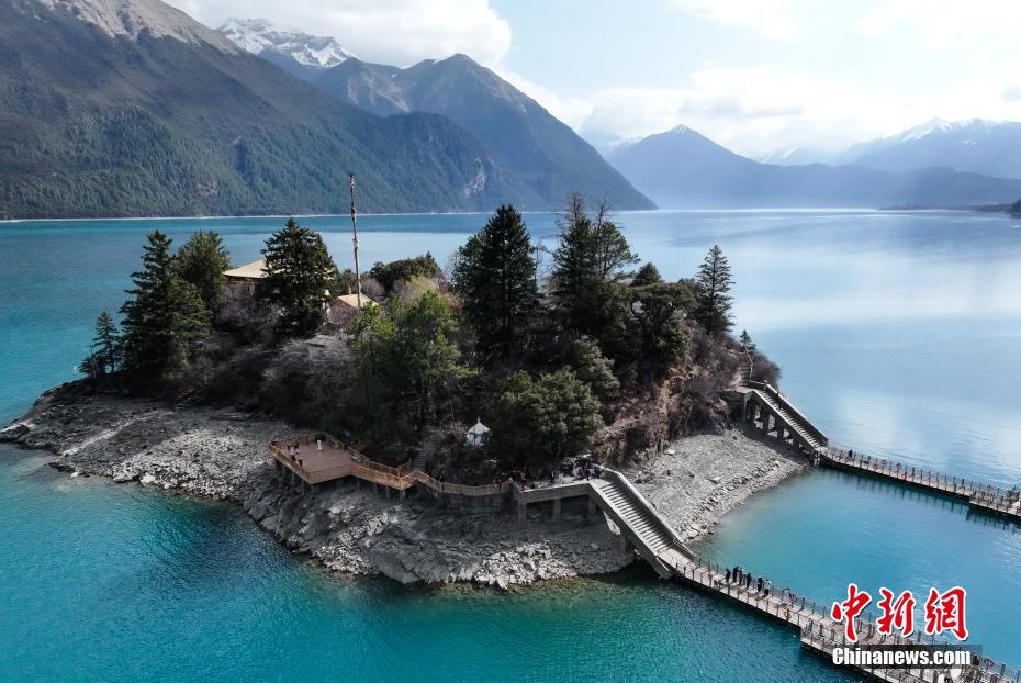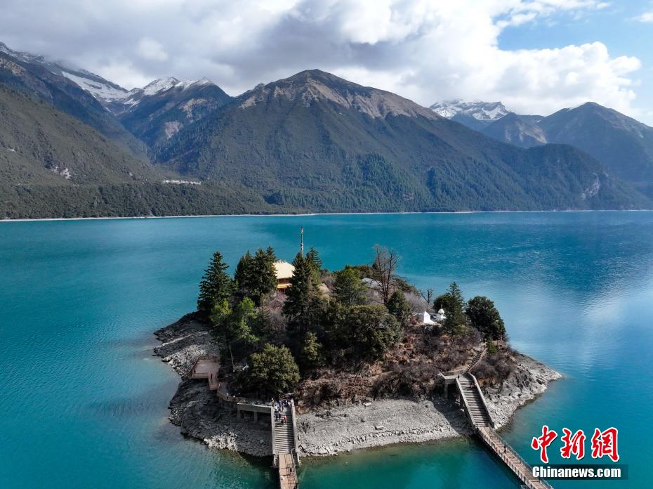3月30日,航拍巴松措湖心島。巴松措又名錯高湖,位于西藏自治區(qū)林芝市工布江達縣,是西藏首個自然風景類國家5A級旅游風景區(qū)。從空中俯瞰巴松措,碧藍的湖水被雪山、森林環(huán)繞,宛如鑲嵌在群山間的“藍寶石”。(無人機照片)中新社記者 馬銘言 攝