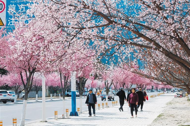 桃花盛開的巴宜區(qū)尼池中路。記者 謝筱純 劉楓 攝