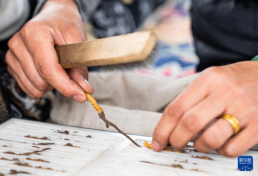 在那曲市索縣西昌鄉(xiāng),牧民將清理好的蟲草裝袋收納(5月18日攝)。新華社記者 丁增尼達(dá) 攝 ??