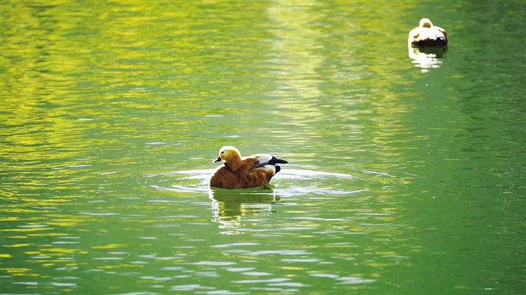 沿著蜿蜒的棧道,向濕地深處走去,清澈的湖水倒映著藍(lán)天、白云,仿佛置身于夢幻般的境界。天空中不時有鳥兒飛過,水中的赤麻鴨自由自在地游來游去,赤麻鴨寶寶排成“一”字隊形,緊隨媽媽身后。這里不僅是鳥類棲息的天堂,也是攝影愛好者最佳的觀鳥地。