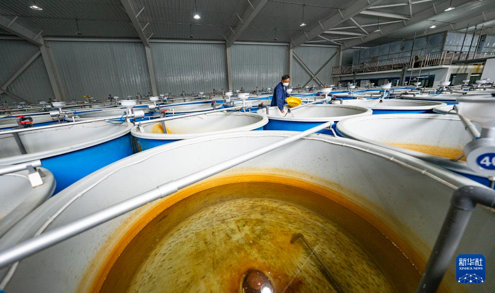 工作人員在育苗車(chē)間給亞?wèn)|鮭魚(yú)魚(yú)苗喂食(6月19日攝)。新華社記者 丁增尼達(dá) 攝 ??