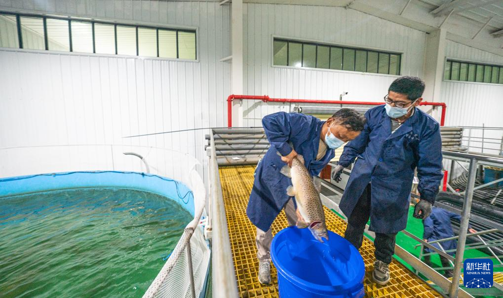 工作人員在查看亞?wèn)|鮭魚(yú)長(zhǎng)勢(shì)(6月19日攝)。新華社記者 丁增尼達(dá) 攝