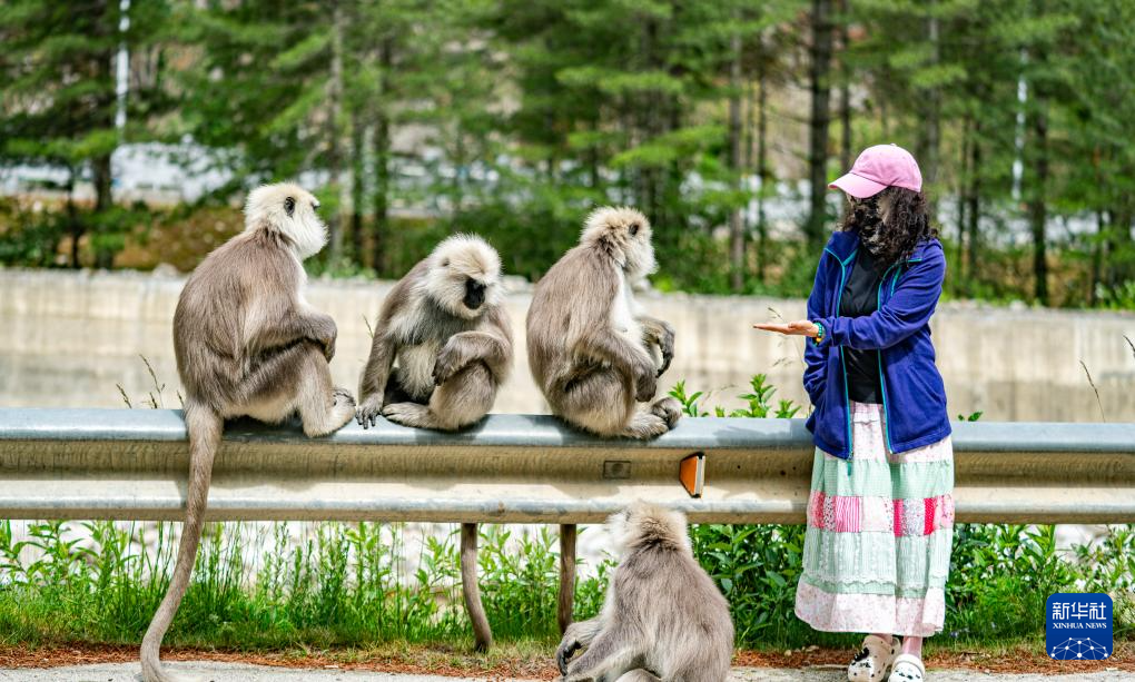 6月20日,在亞東縣一條公路邊,游客在和長尾葉猴互動。新華社記者 丁增尼達(dá) 攝 ??