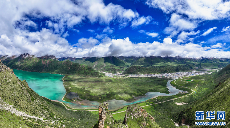 圖為7月2日拍攝的嘉乃玉錯(cuò)與不遠(yuǎn)處的嘉黎縣縣城(無人機(jī)照片)。新華網(wǎng)發(fā) 車宇軒 攝