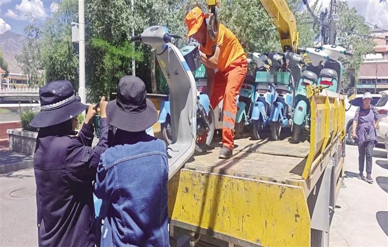工作人員督促企業(yè)調(diào)離轄區(qū)超量共享電動(dòng)車(chē)。圖由城關(guān)區(qū)城管局提供