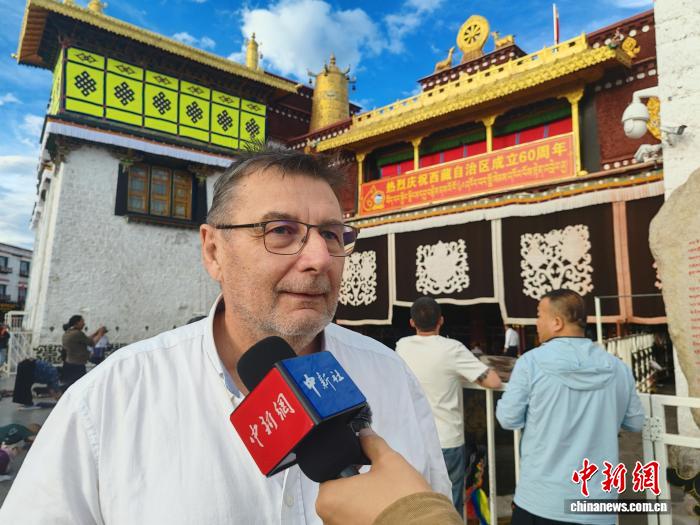 8月19日,法國(guó)游客Jean Francois在大昭寺前接受采訪。中新社記者 楊程晨 攝