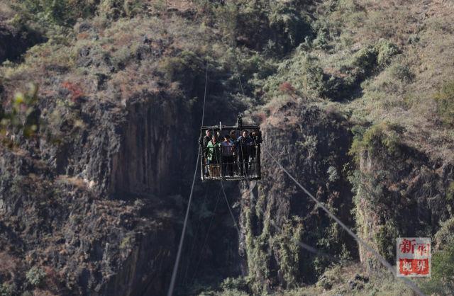 幾位村民通過溜索從云南巧家縣鸚哥村前往四川布拖縣馮家坪村。新華社記者江宏景 攝