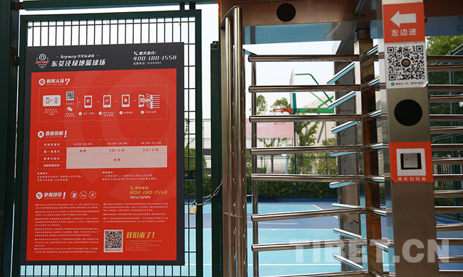 靜安區(qū)東茭涇綠地籃球場。球場采用分時段計費(fèi)的方式,市民可以通過掃描二維碼使用場地。