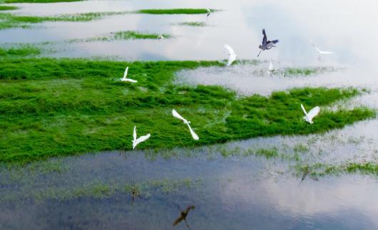 一群白鷺棲息在重慶濕地地帶。他們成群結(jié)對,在這里覓食,綠色的草海成了它們的樂園。