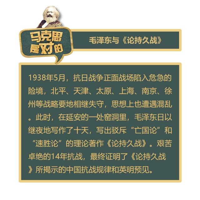 毛澤東同志說過一句話,他說:“馬克思主義有幾門學問,但基礎(chǔ)的東西是馬克思主義哲學。這個東西如果沒有學通,我們就沒有共同的語言,沒有共同的方法,扯了許多皮,扯還扯不清楚。有了辯證唯物論的思想,就省了許多事,也少犯許多錯誤?!薄墩摮志脩?zhàn)》就是一個十分典型的例子。這部著作分析了中日雙方相互矛盾著的四個基本特點,它就是敵強我弱、敵小我大、敵退步我進步、敵寡助我多助。根據(jù)這些特點的分析,就作出了中國不會滅亡,也不能速勝。只要經(jīng)過艱苦、持久的抗戰(zhàn),最后的勝利一定屬于中國的這樣一個正確的結(jié)論,這就為中國人民的抗日戰(zhàn)爭指明了勝利的方向。