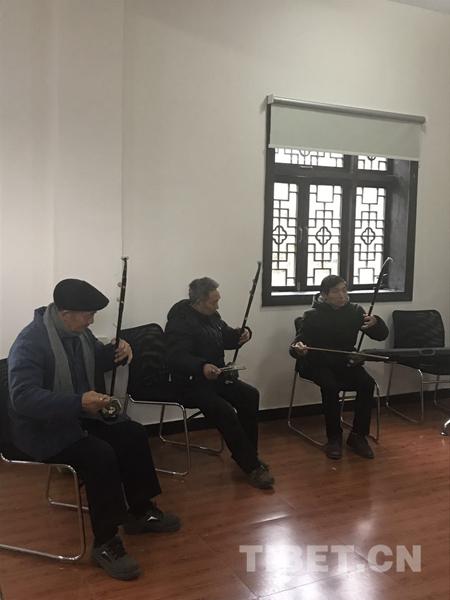 圖為村民們?cè)诨顒?dòng)室拉起二胡唱起歌