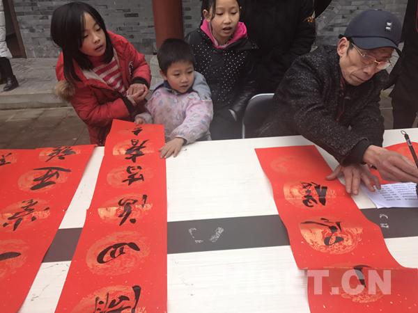 圖為方永明老人在為村民寫(xiě)春聯(lián)