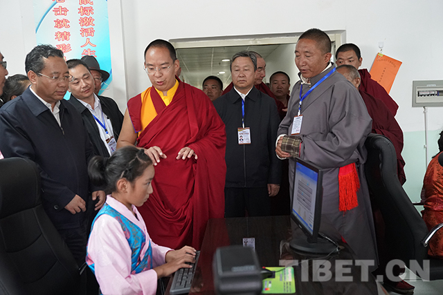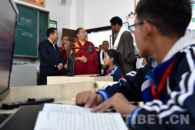 圖為十一世班禪在電教室了解學生學習情況。攝影:王淑