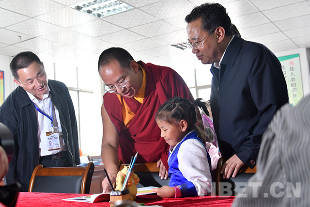圖為十一世班禪在圖書室了解孩子們的學習情況。攝影:扎西