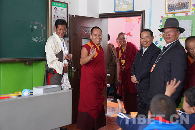 圖為十一世班禪向老師了解孩子們的學習情況。攝影:扎西