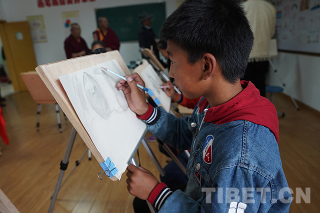 美術(shù)室里,十一世班禪與小“畫家”們交流。攝影:王淑