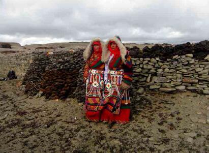 瑪旁布姆卡是西女國女王居住的城堡,普蘭縣文化局局長加措根據(jù)藏文大字典和《阿里史地探秘》的“瑪旁布莫卡”,解釋出“布”的漢文詞義,就是女人、女性、女子或者女王。“莫”就是香草或者香草遍布此山。據(jù)當?shù)匕傩战榻B,城堡遺址坐落在普蘭神湖瑪旁雍措湖的東部扎藏布溫泉溝南側(cè)的野嶺上,海拔5000米上下。在遺址上部高處還有一個碩大蘑菇形狀的巖石巋然迎風屹立城堡上方,與下方城堡遺址交相輝映。這即是“出俞石、朱砂、麝香、牦牛、駿馬、蜀馬,尤多鹽,恒將鹽向天竺興販,其利數(shù)倍”西女王國的王城。在城堡上方更高處的山后,遺留有眾多的洞穴,說明女國的百姓就居住在女王的周圍。此外在山坡的下方扎藏布溝處,當?shù)匕傩辗Q這塊地方為“卡爾青”,意思是大城堡之地。盡管史書上的記載十分有限,瑪旁布姆卡的故事仍然世世代代流傳在當?shù)匕傩盏男闹??;魻柎逡晃荒赀~的老百姓告訴筆者,溫泉溝和曲古寺廟附近就有許許多多女王的傳說,聽說女王曾經(jīng)在此沐浴,但不知具體在什么地方。