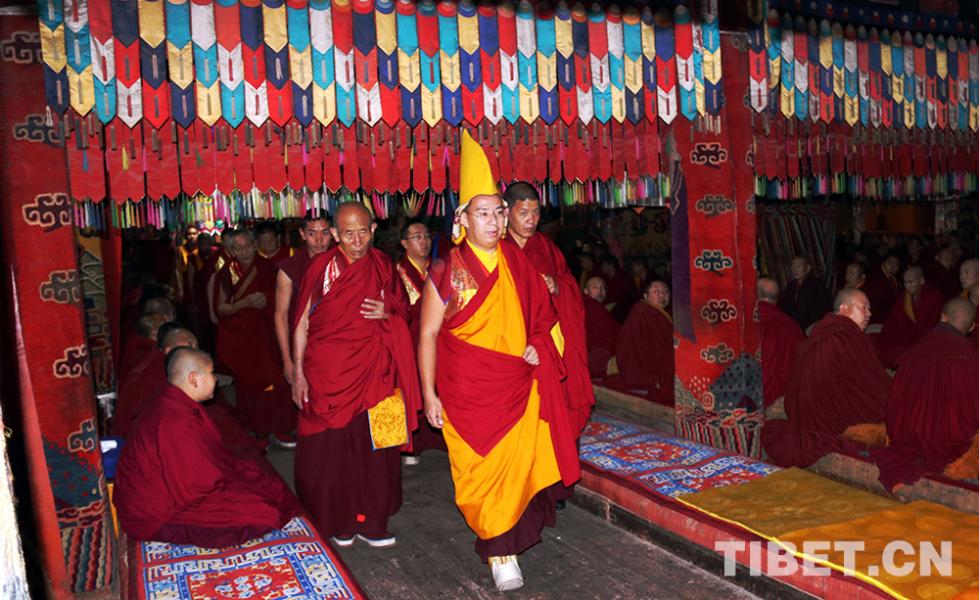 7月21日,清晨5點多,車隊來到位于西寧市湟中縣靜謐的塔爾寺。只見一位僧人穿著絳紅色的僧裝,走下車,這時早早迎候在塔爾寺門口的僧人儀仗隊,鼓樂齊鳴,隆重歡迎這位重要的僧人——班禪額爾德尼o確吉杰布。