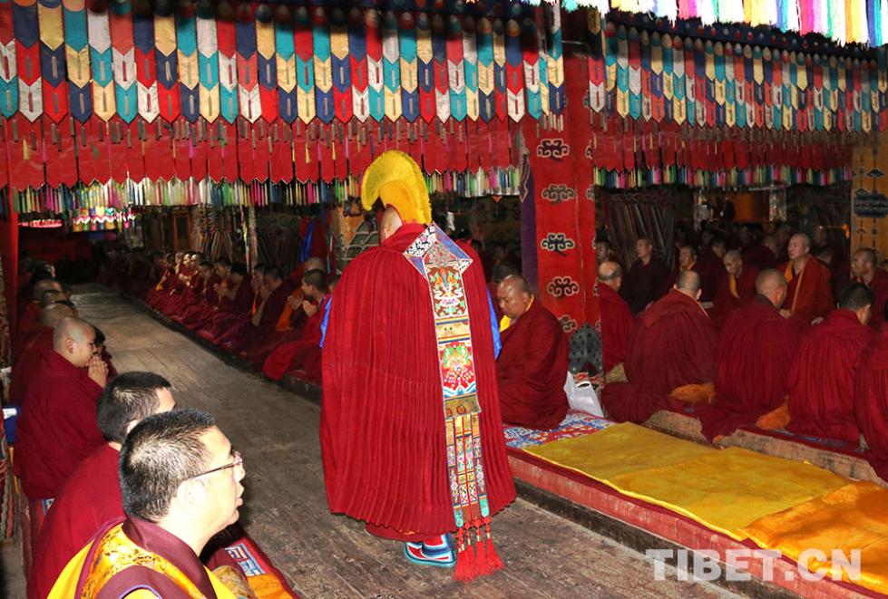 塔爾寺僧眾在大經(jīng)堂集體誦經(jīng)祈福。