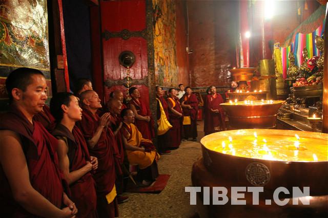 班禪還到扎什倫布寺大藏經(jīng)堂、漢佛堂、強巴佛殿等佛殿和經(jīng)堂,和各殿堂僧人一起念經(jīng)祈禱。每到一處佛殿,班禪與陪同高僧一道領(lǐng)誦經(jīng)文、拋灑青稞,祈愿五谷豐登、六畜興旺、國泰民安。攝影:王淑。