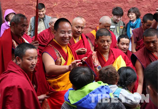 班禪朝拜完強巴佛殿出來后,看到恭候在外的人們,不辭辛勞,面帶微笑,一一為信教群眾和游客們摸頂賜福。攝影:王淑。