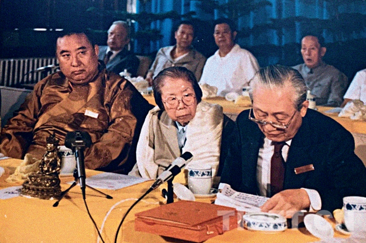 十世班禪和趙樸初顧問(wèn)在中國(guó)藏語(yǔ)系高級(jí)佛學(xué)院成立儀式新聞發(fā)布會(huì)上接受媒體采訪。中國(guó)藏語(yǔ)系高級(jí)佛學(xué)院提供