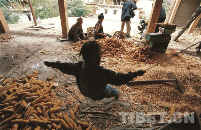 十月的鹽井正是收獲的季節(jié),金燦燦的玉米和圓潤(rùn)飽滿(mǎn)的核桃鋪滿(mǎn)了每家每戶(hù)的房頂,樹(shù)上的水果吃不及,石榴、蘋(píng)果和梨掉了一地,路邊的小孩人手一支彈弓——用來(lái)打樹(shù)上的果子吃。動(dòng)作慢的人家還在地里收割玉米、搶先一步的人家已經(jīng)在將曬干的玉米放進(jìn)脫粒機(jī)了,而運(yùn)核桃的汽車(chē)、馬幫則已經(jīng)上路。農(nóng)忙中的鹽井一派熱鬧歡騰景象。
