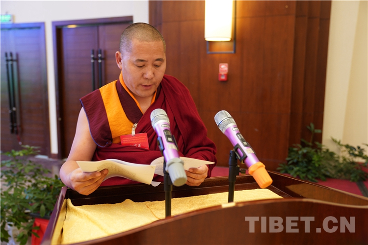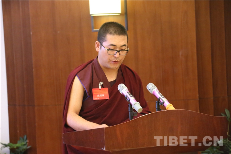 西藏自治區(qū)政協(xié)副主席、中國佛教協(xié)會(huì)西藏分會(huì)常務(wù)副會(huì)長(zhǎng)、西藏佛學(xué)院院長(zhǎng)珠康?土登克珠以“維護(hù)祖國統(tǒng)一和民族團(tuán)結(jié),堅(jiān)決反對(duì)分裂”為題,作教義闡釋演講。