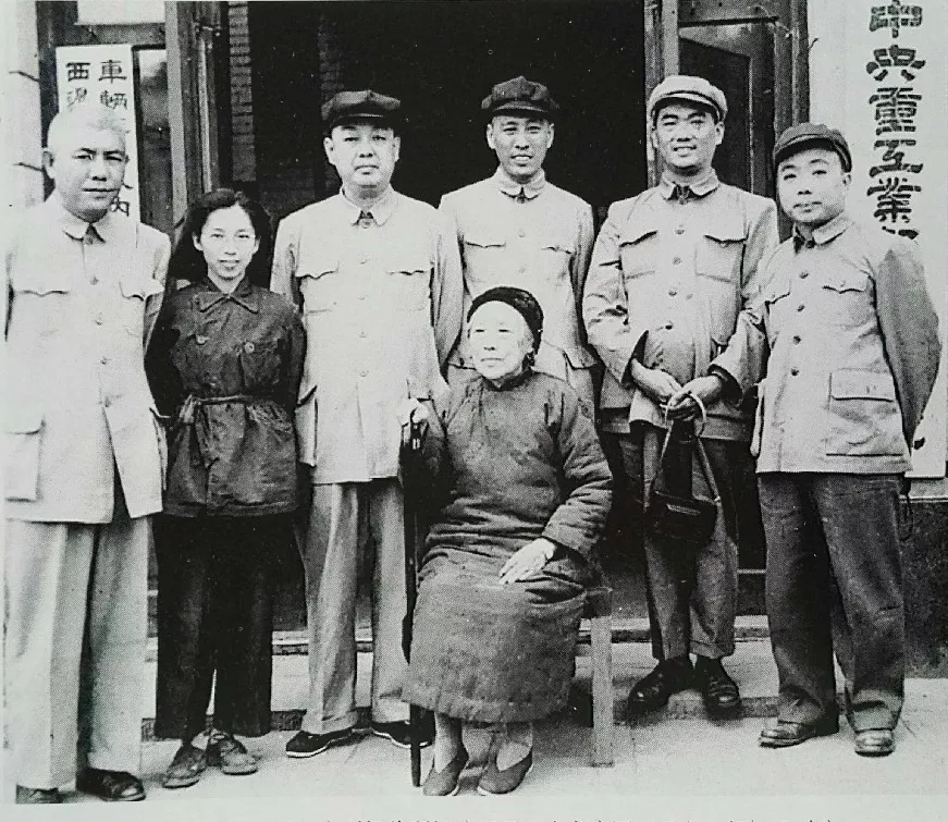 1951年4月,何香凝看望解放后第一批回國的印尼華僑回國工商業(yè)考察團。中坐者為何香凝,后排站立左一為王源興、左三為黃潔、左四為家父李祝朝、左五為薛兩清、左六為施子卿。