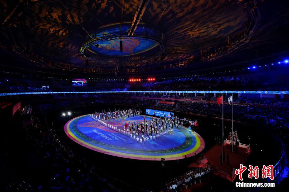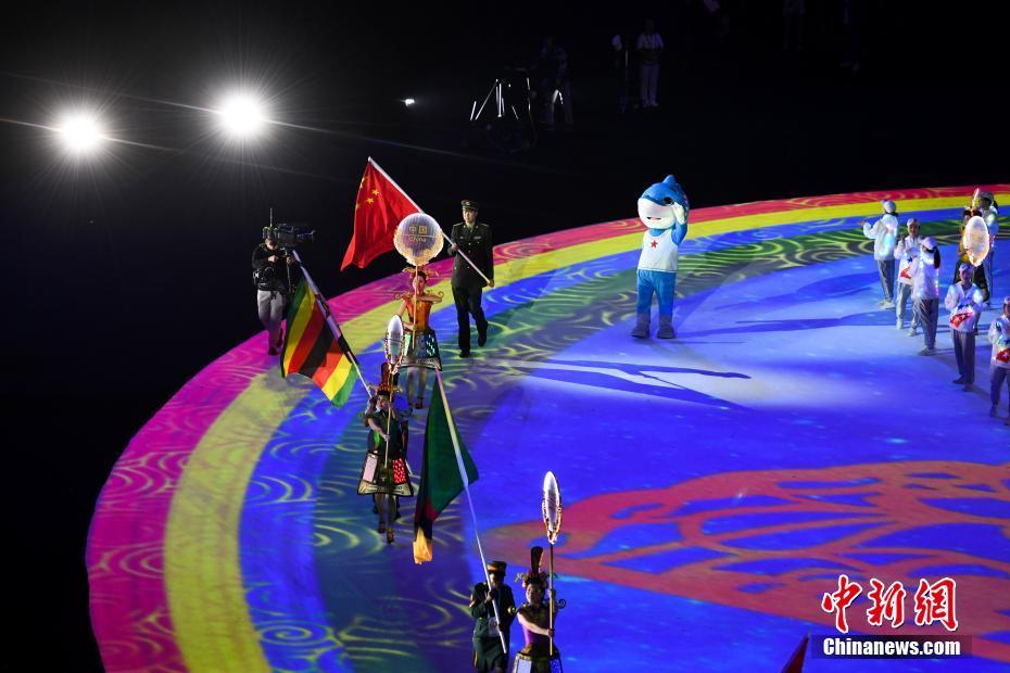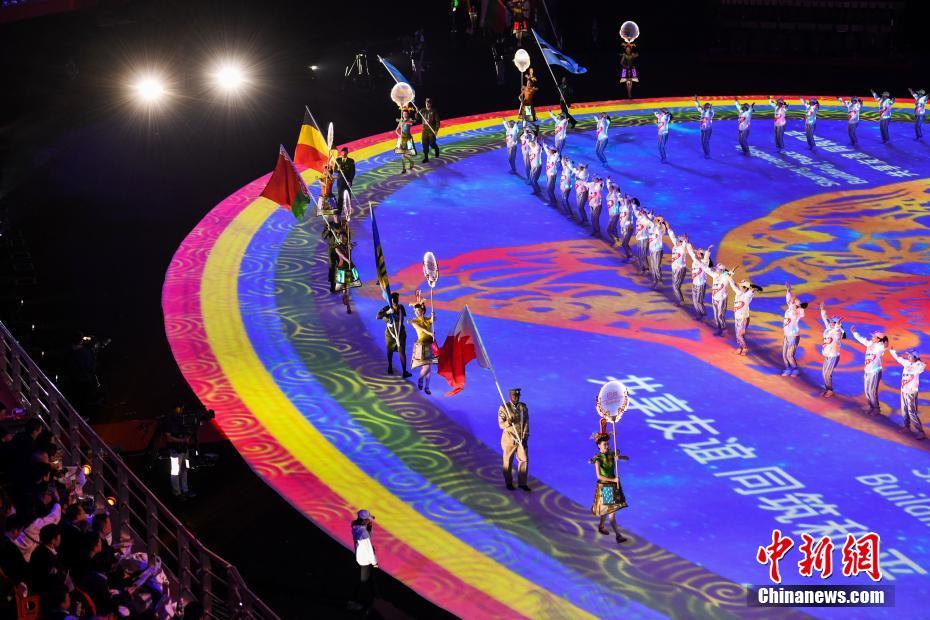 圖為各參賽國(guó)國(guó)旗入場(chǎng)。 中新社記者 何蓬磊 攝