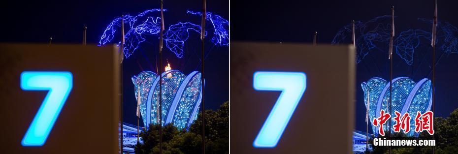 圖為本屆軍運(yùn)會(huì)圣火熄滅前和熄滅后的對(duì)比(拼版圖片)。 中新社記者 侯宇 攝