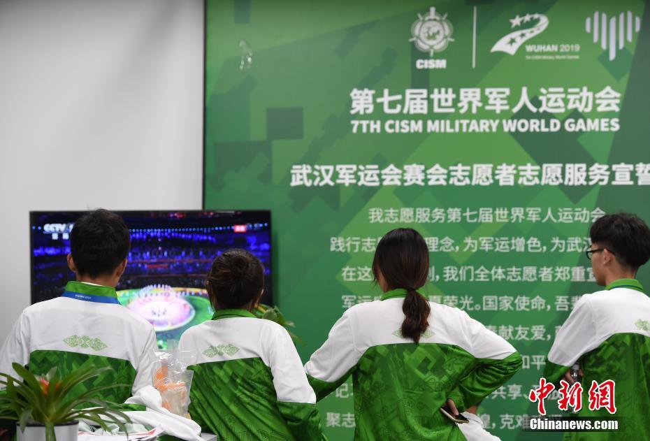圖為本屆軍運(yùn)會(huì)志愿者“小水杉”關(guān)注閉幕式直播。 中新社記者 侯宇 攝