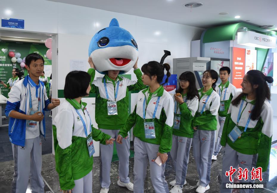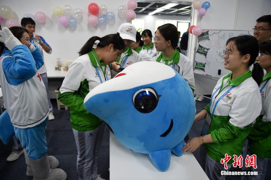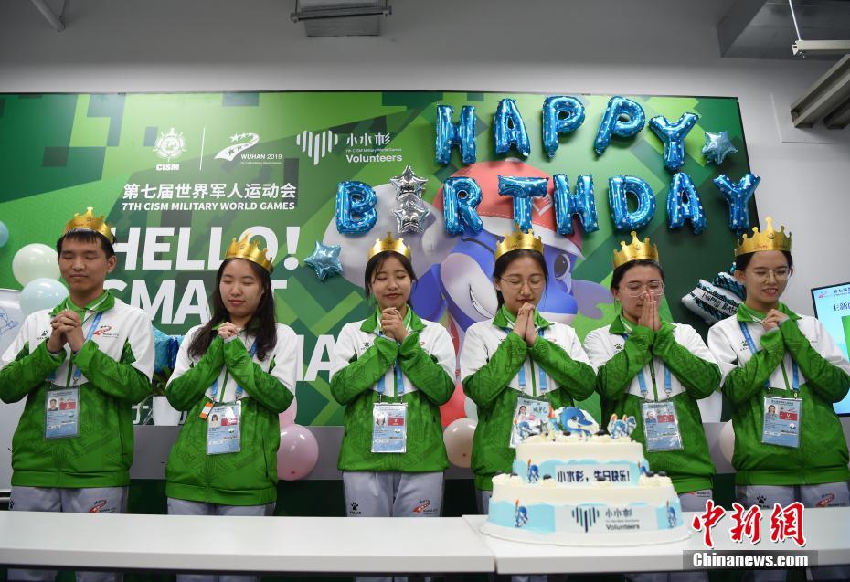 10月24日,幾位在第七屆世界軍人運(yùn)動(dòng)會(huì)舉辦期間迎來(lái)生日的志愿者“小水杉”在主媒體中心內(nèi)的“志愿者之家”過(guò)集體生日。圖為軍運(yùn)會(huì)吉祥物“兵兵”向過(guò)生日的志愿者們送上小禮物。中新社記者 侯宇 攝