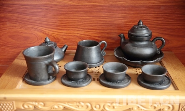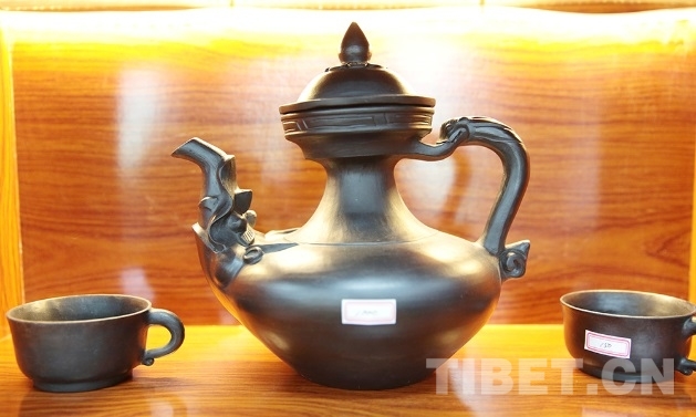 圖為班瑪縣電子商務服務中心內(nèi)展示的黑陶茶具 攝影:楊月云