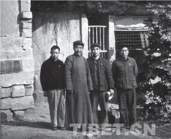 1974 年,任乃強先生(左二)與考古人員在巖屋前
