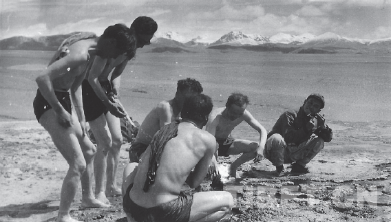 阿里分隊1976年8月在日土縣帕也布也雪山下的帕也曲真溫泉邊洗澡。站立者左為黃復生,右為孫鴻烈;蹲坐者右起:章銘陶、謝自楚、武素功等 王富葆/攝影