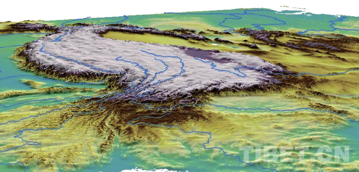 青藏高原衛(wèi)星圖片上,藍色的水系是根據(jù)原始數(shù)據(jù)繪制的。自右至左為:黃河,金沙江—長江,瀾滄江—湄公河,怒江—薩爾溫江,雅魯藏布江—布拉馬普特拉河,獨龍江—伊洛瓦底江。左上角阿里境內(nèi)的獅泉河、象泉河、孔雀河等外流河,分別成為印度河、恒河的源頭或上源支流 楊經(jīng)綏/供圖