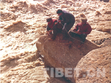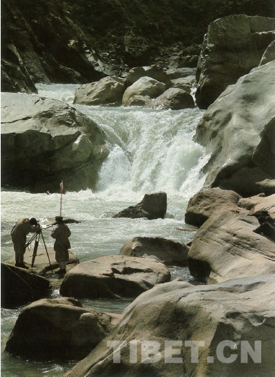 雅江考察任務(wù),除對水文特征——河道、流量、泥沙、水化學、洪枯水位等等進行調(diào)查外,還負有水能資源及其合理開發(fā)利用、開發(fā)方式和工程條件的評價職責。關(guān)志華從地形圖和航拍照片上、從當?shù)卦L問中得知,桑日—加查峽谷中有兩大瀑布,決定前往探察。為確保安全,山南地區(qū)及駐軍派出藏族向?qū)Ш陀柧氂兴氐膫刹毂S行。
