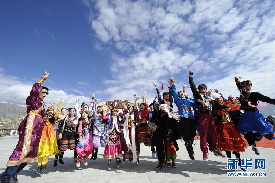 參加“民族情 雪域行”活動(dòng)的民族團(tuán)結(jié)形象代表在西藏拉薩布達(dá)拉宮廣場(chǎng)合影(2012年9月27日攝)。新華社記者 覺果 攝